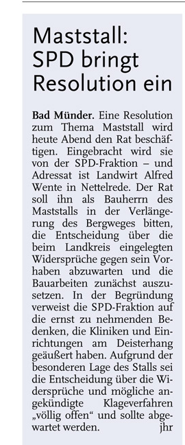 HAZ LN 06.03.2014 MASTSTALL: SPD BRINGT RESOLUTION EIN
