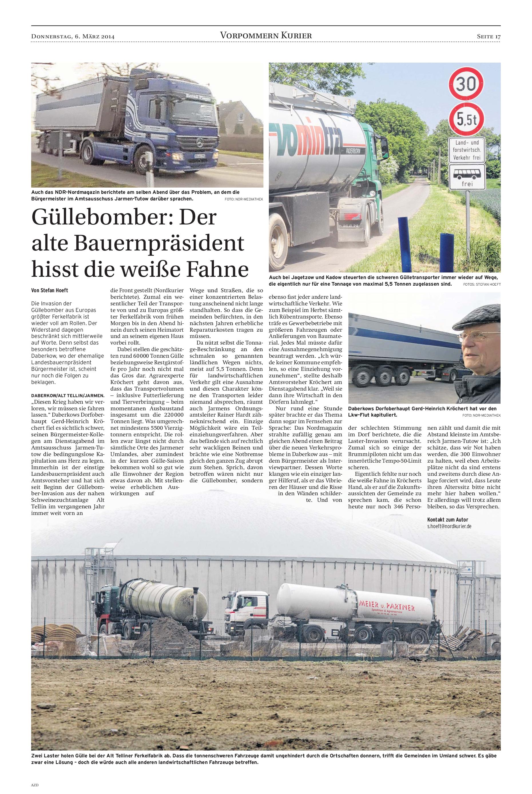 NORDKURIER, NEUBRANDENBURG 06.03.2014 GÜLLEBOMBER: DER ALTE BAUERNPRÄSIDENT HIßT DIE WEIßE FAHNE