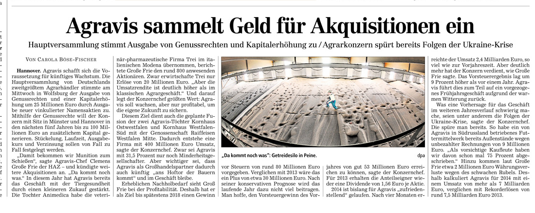 HAZ 02.05.2014 AGRAVIS SAMMELT GELD FÜR AKQUISITIONEN EIN