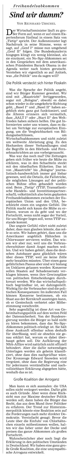 HAZ 07.05.2014 LEITARTIKEL REINHARD URSCHEL: FREIHANDELSABKOMMEN – „SIND WIR DUMM?“