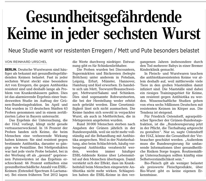 - RP-Online 20.05.2014: „Gefährliche Keime in der Wurst“