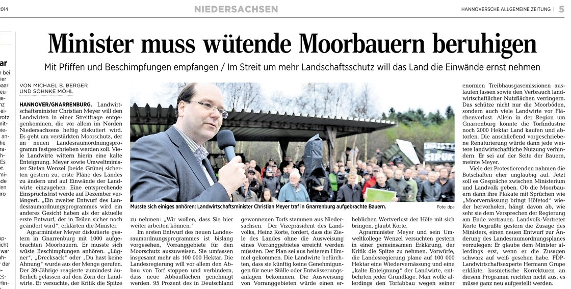 HAZ 06.11.2014 MINISTER MUSS WÜTENDE MOORBAUERN BERUHIGEN