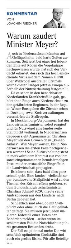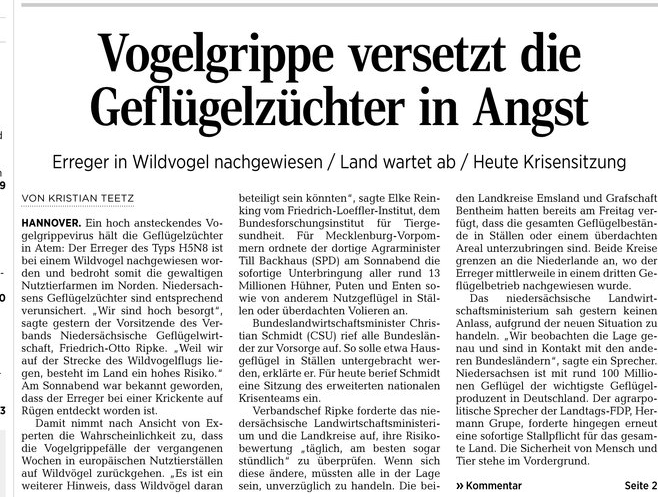 HAZ TITELSEITE 24.11.2014 VOGELGRIPPE VERSETZT GEFLÜGELZÜCHTER IN ANGST