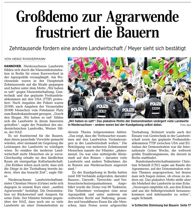 HAZ TITELSEITE 18.01.2015 GROSSDEMO ZUR AGRAWENDE FRUSTRIERT DIE BAUERN